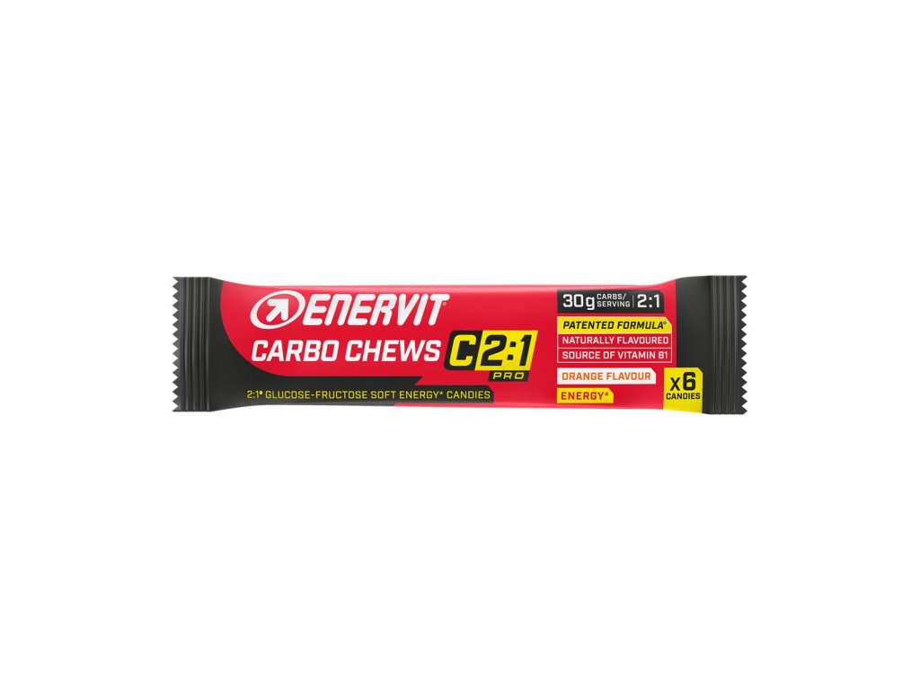 6 ks energetických želatíniek s obsahom 30 gramov sacharidov (glukóza:fruktóza v pomere 2:1) a vitamínom B1 na príjem energie počas dlhotrvajúceho alebo vysoko intenzívneho výkonu. Novinka v príjme energie počas výkonu od Enervitu. Pomarančová príchuť. Enervit Carbo Chews C2:1 je súčasťou nového radu C2:1 pre maximálnu výkonnosť. ÚČINKY Dodáva energiu pri tréningu alebo súťaži – 5 g sacharidov/1 želatínka. PREDNOSTI ŽELATÍNIEK Nová forma príjmu energie počas výkonu od Enervitu. Sacharidy v kombinácii glukózy a fruktózy zodpovedajú optimálnemu pomeru (2:1) pre maximalizáciu príjmu energie z pohľadu fyziologických zákonitostí organizmu. Nulový obsah bielkovín a tukov – jednoduchá absorpcia. Príjemná pomarančová chuť. Možnosť postupného dávkovania po jednotlivých želatínkach (6 ks/balenie). Možnosť jednoduchej kombinácie s ďalšími produktami počas výkonu. KEDY A AKO POUŽÍVAŤ ENERGETICKÉ ŽELATÍNKY Energetické želatínky použite POČAS výkonu pre efektívne doplňovanie energie (30 g sacharidov/balenie) pri dlhodobých alebo vysoko intenzívnych výkonoch. PREDNOSTI PRODUKTOV ENERVIT C2:1 Vyznačuje sa optimálnym pomerom (2:1) vhodných sacharidov (glukóza:fruktóza) pre maximálny výkon. Obsahujú „guľatú“ dávku sacharidov komunikovanou priamo na obale, vďaka čomu sa príjem energie počas výkonu veľmi dobre počíta. Vysoké dávky sacharidov sú „nahustené“ do malých objemov (skladnosť, nie je potrebné konzumovať väčšie objemy výživy) a servírované vo viacerých formách (aby sa dalo dobre jesť a kombinovať – ponuka je pestrá a variabilná). Sú vhodné pre dlhodobé výkony v strednej intenzite alebo pre vysoko intenzívne výkony. Vyvinuté v spolupráci s profesionálnymi cyklistickými stajňami Trek-Segafredo a UAE Team Emirates.
