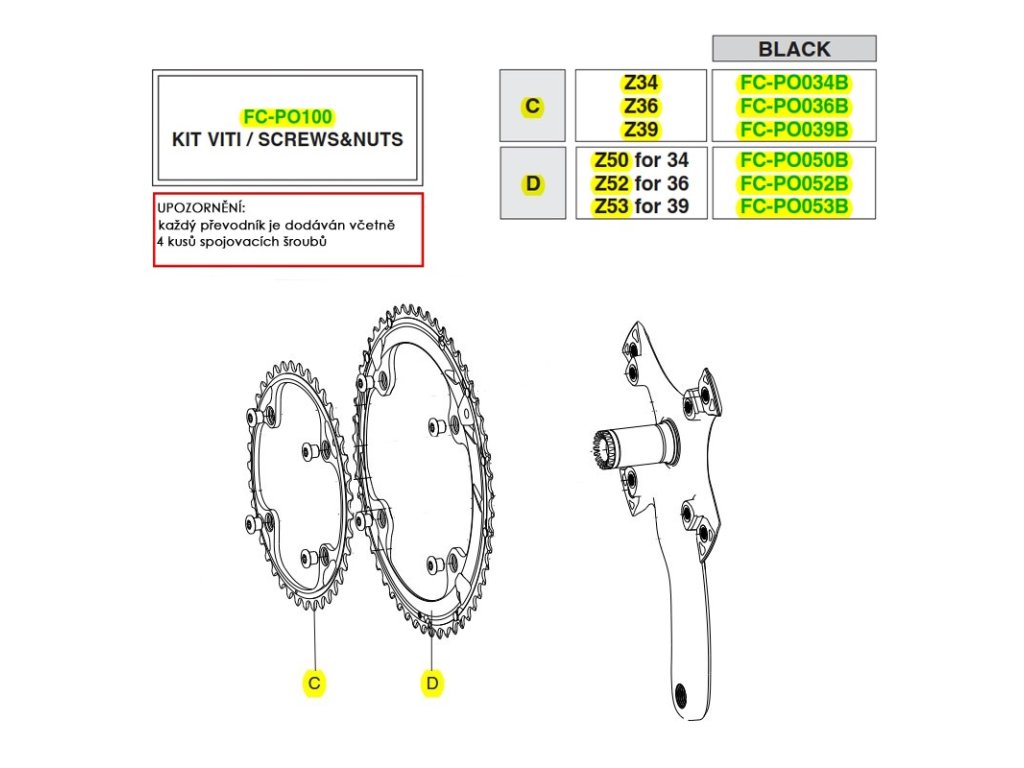 Prevodovka série Potenza 11s na montáž na 4. rameno kľuky. Od vyššej série Super Record 11s sa líši čiernou farbou. Prevodník obsahuje 4 skrutky na upevnenie na kľuky.